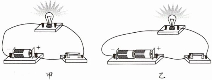 2. 小明用如图所示的装置进行实验。如图甲所示,闭合开关发现小灯泡亮度比较暗;如图乙所示,保持其他器材不变,把电池增加至两节,闭合开关发现小灯泡的亮度变亮。小明探究的问题是: