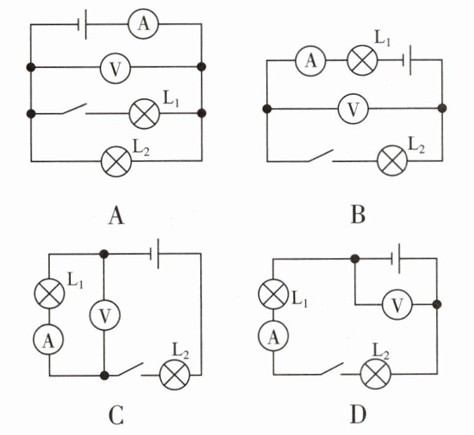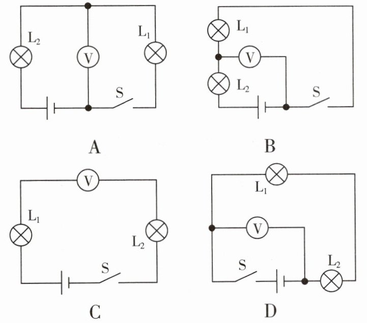 8. (双选)如图所示,闭合开关$S$后,能测出灯$L_{1}$两端电压的电路图是 (