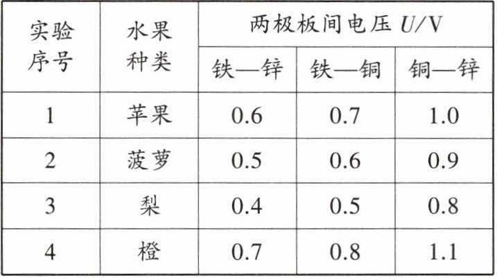 ② 分析数据可知,水果电池的电压与极板材料有关,表中效果最好的两极板材料是