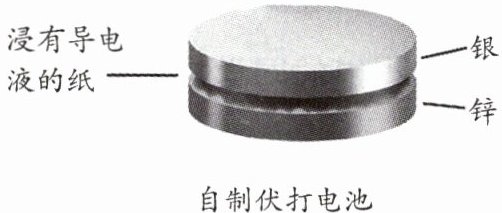 2. 爱好科技的小华对最早的电池——伏打电池产生了浓厚的兴趣。通过上网查资料,他了解伏打电池的结构后,决定亲自动手制作。如图是他制作出来的电池,银片和锌片分别是电池的两极。请你帮他设计实验判断该电池的正极是银片还是锌片。