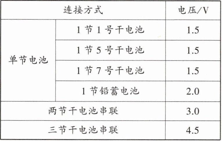 1. 如图所示,电池有很多种类型,它们的电压有何特点?某同学利用电压表,对不同类型电池电压的特点进行了探究,实验的结果如下表所示。