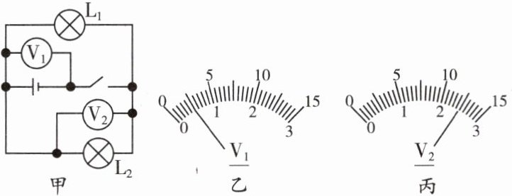 11. 如图甲是测量电压的电路图,闭合开关后,两个电表的指示情况如图乙、丙所示,则 $ L_1 $ 两端的电压是