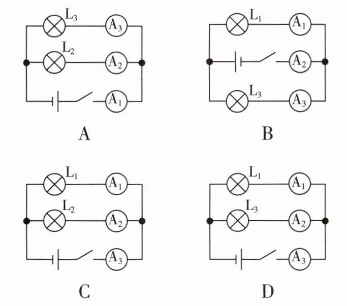 5. 小明在探究并联电路的电流规律实验时用了图中的某个电路。已知 $ L_1 $ 和 $ L_2 $ 规格相同,$ L_3 $ 与 $ L_1 $ 规格不同,电流表 $ A_1 $ 读数为 $ 0.3 \, A $,$ A_2 $ 为 $ 0.15 \, A $,$ A_3 $ 为 $ 0.45 \, A $。测量时的电路图应是(