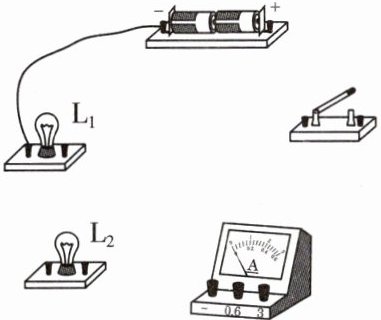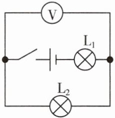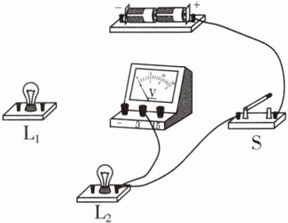 9. 请用笔画线代替导线把如图所示实物电路按要求连接完整。要求:两灯串联,电压表只测 $ L_2 $ 灯两端的电压,开关控制整个电路,导线不能交叉。