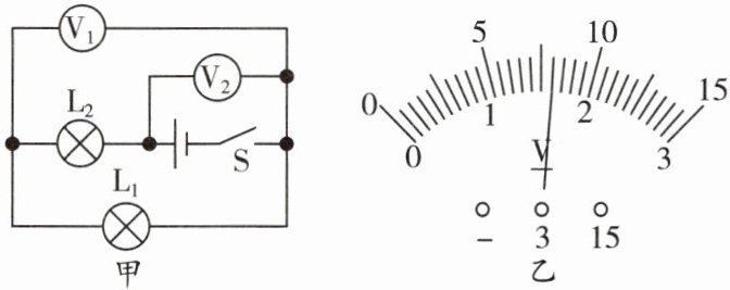 (选填“串联”或“并联”);当闭合开关 $ S $ 后,两个电压表指针偏转情况均如图乙所示,则灯泡 $ L_2 $ 两端电压为6.4