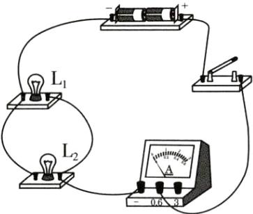 6. 如图所示,请用笔画线代替导线连接电路。要求:两灯泡并联,开关为干路开关,电流表测干路的电流,电路的总电流约为 $ 0.4 \, A $。