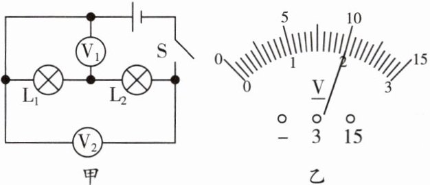 3. (双选)如图甲所示电路中,当闭合开关 $ S $ 后,$ L_1 $、$ L_2 $ 两灯均发光,两个电压表指针偏转角度相同,指针位置如图乙所示。若通过 $ L_1 $、$ L_2 $ 的电流分别为 $ I_1 $、$ I_2 $,加在 $ L_1 $、$ L_2 $ 两端的电压分别为 $ U_1 $、$ U_2 $。下列说法正确的是(