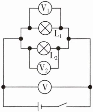 B.电压表 $ V_1 $ 示数小于电压表 $ V_2 $ 示数