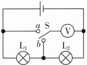 2. 如图所示的电路,电源电压保持不变,开关 $ S $ 接到 $ a $ 时,电压表示数为 $ 9 \, V $,开关 $ S $ 接到 $ b $ 时,电压表示数为 $ 4 \, V $,下列说法正确的是(