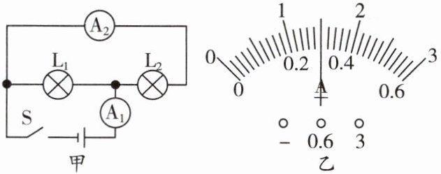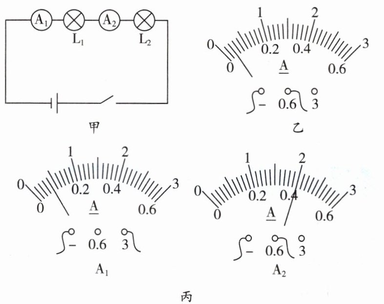 (3)排除故障后,闭合开关,发现两个电流表 $ A_1 $ 和 $ A_2 $ 的指针偏转情况如图丙所示,其中电流表 $ A_1 $ 的示数是