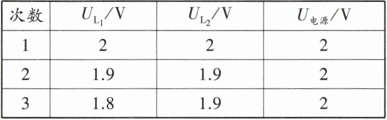 | 次数 | $ U_{L_1}/V $ | $ U_{L_2}/V $ | $ U_{电源}/V $ |