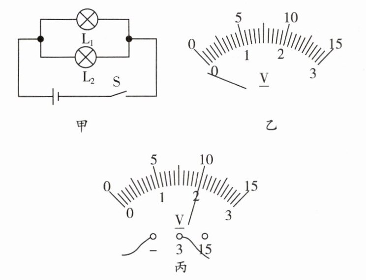 。(2)正确测量灯泡 $ L_2 $ 两端电压,电压表指针如图丙所示,其示数为