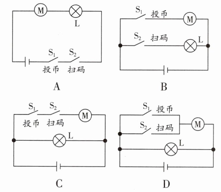 7. (2025·湖南) 某商场有一台棉花糖自助售货机,接通电源后,指示灯L一直发光,人们可通过投币或扫码的方式购买棉花糖。当投币或扫码成功时,对应开关闭合,电动机开始工作,完成棉花糖自动出售服务。下列设计的模拟电路图符合以上要求的是(