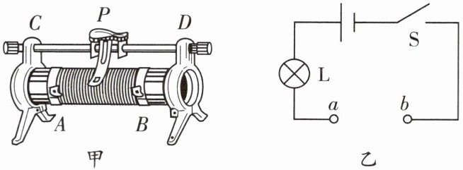12. 将图甲所示的滑动变阻器连入图乙电路的$a、b$两点间,当滑片$P向C$端移动时,电灯$L$逐渐变亮,则滑动变阻器连入电路的接线柱应该是 (