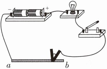 10. 如图所示,$ab$为一根铅笔芯,闭合开关后,小灯泡发光,当金属夹左右移动时,小灯泡的亮度会发生变化。导致铅笔芯接入电路的电阻发生变化的主要因素是导体的
