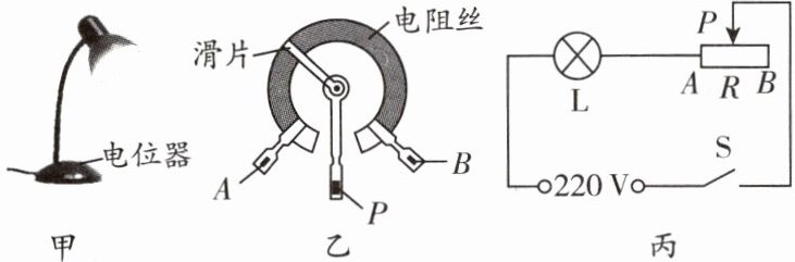 6. 图甲为一盏可调亮度的台灯,图乙为其用于调光的电位器结构图,$A$、$B$、$P$是它的三个接线柱,其中$P$与金属滑片相连。台灯内部简化电路如图丙所示,当顺时针转动电灯旋钮时,滑片会在弧形电阻丝上顺时针滑动,即可调节灯泡的亮度。已知电源电压为$220V$,灯$L的阻值为2000Ω$,滑动变阻器$R的最大阻值为3500Ω$。(不考虑灯丝电阻随温度的变化)求: