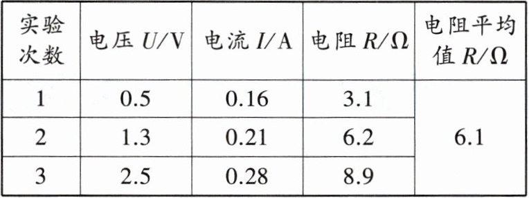 。| 实验次数 | 电压 $ U/V $ | 电流 $ I/A $ | 电阻 $ R/\Omega $ | 电阻平均值 $ R/\Omega $ |