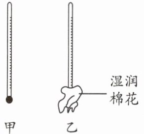 C.温度计乙的示数会减小,原因是棉花中的水蒸发,需要吸热