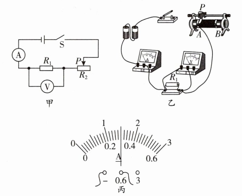 (4)排除故障后,当电压表示数为 $ 2.7 V $ 时,电流表示数如图丙所示,则通过 $ R_1 $ 的电流大小为______ $ A $,它的阻值是______ $ \Omega $。