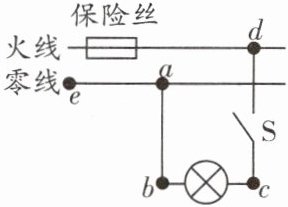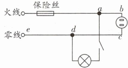 4. 如图,是家庭电路的一部分。若进户零线(ae段)断路,其他部分完好,闭合开关后,能使测电笔氖管发光的点有
