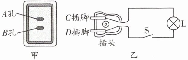 1. 如图甲所示是小刚家的一个插座,小刚用测电笔接触插座A孔,氖管发光;乙图是一个台灯的电路示意图。当把台灯接入电路时,为了安全,应将台灯插头的______(选填“C”或“D”)插脚插入A孔。