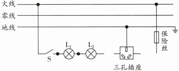 5. 教室内有两盏额定电压为$220V的电灯和1$个带有保险丝的三孔插座,请按照安全用电的要求在下图中连接电路,要求开关S只控制两盏灯,且一盏灯坏了另外一盏灯仍然能正常发光。