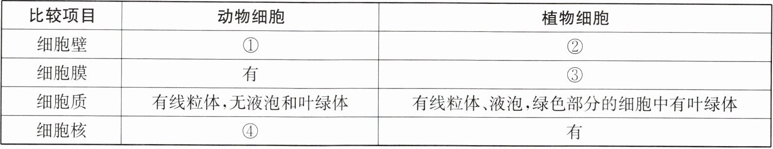 10. 某同学将动物细胞与植物细胞的结构进行比较,如下表所示。下列表中序号所代表的内容,正确的是(