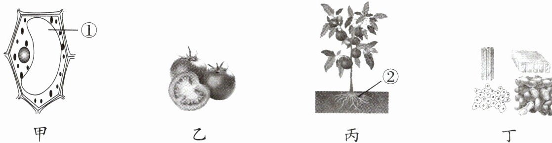 思路导引 切番茄时,流出大量汁液,这些汁液主要来自图甲中的①液泡;图乙为果实,图丙中的②是根,二者均属于器官层次;番茄植株的结构层次为甲(细胞)→丁(组织)→乙(器官)→丙(植物体);人的心脏属于器官,而图丁属于组织,二者不是同一个结构层次。