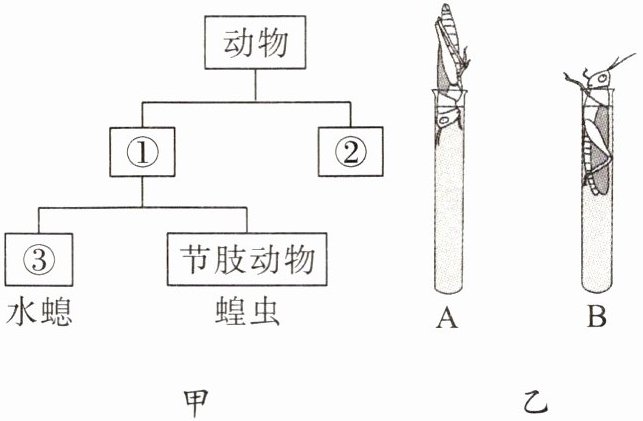 (4)为了探究蝗虫进行气体交换的部位,小明进行了如图乙所示的实验。取两只大小相同、活力相当的蝗虫,A 试管中蝗虫的胸、腹部朝上,头部浸没在水中;B 试管中蝗虫的头部朝上,胸、腹部浸没在水中。一段时间后,B 试管中的蝗虫先死亡,该实验说明