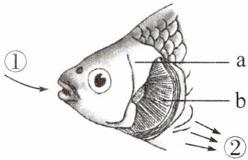 7. 右图是鱼在水中呼吸的示意图,a 和 b 代表结构,①和②代表水流。下列叙述正确的是(