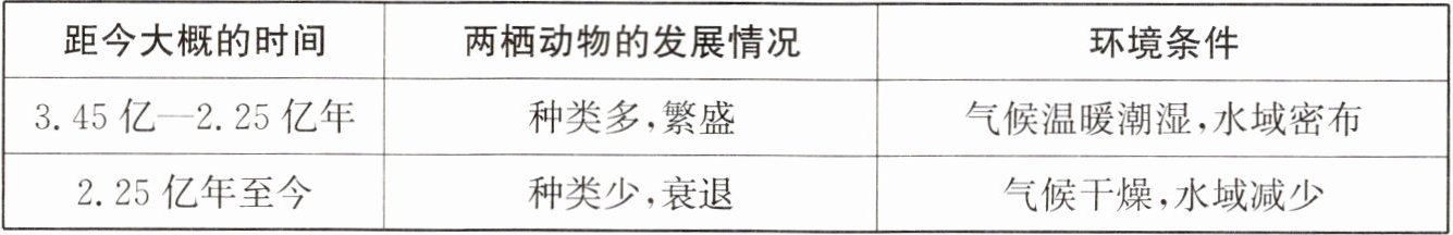 9. 两栖动物在生物圈中经历了由盛到衰的发展过程。据下表分析,导致两栖动物出现这一变化的原因主要是(