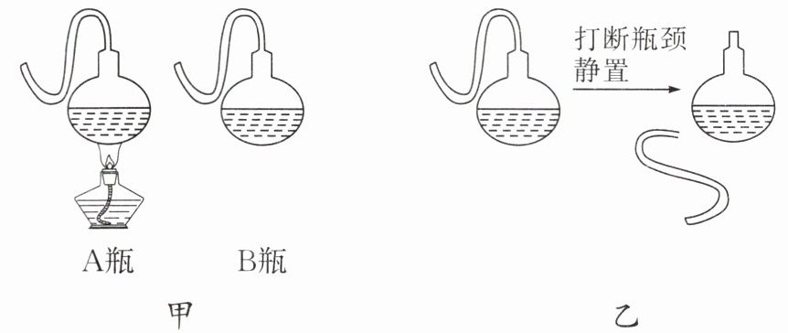 8. 右图中的 A 瓶和 B 瓶内都装有肉汤,图甲表示将 A 瓶肉汤煮沸,B 瓶不做处理。一段时间后,其中一瓶肉汤仍然澄清,另一瓶肉汤变浑浊;接着,将肉汤仍然澄清那瓶的瓶颈打断(如图乙),数日后,该瓶中肉汤也变浑浊。请回答下列问题。