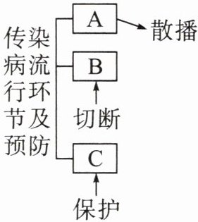 9.B 【解析】新型冠状病毒感染者属于题图中的A传染源。勤洗手、保持安全的社交距离等做法,主要是针对图中B传播途径采取的预防措施。接种疫苗属于保护C易感人群。利用84消毒液对相关物品进行消毒的做法属于图中的切断B传播途径。