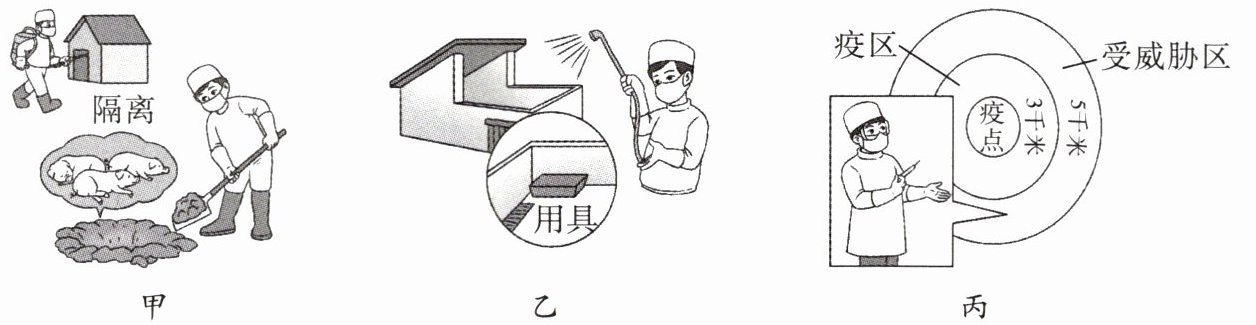 )①感染了该病毒的某昆虫是病原体 ②图甲的做法在传染病的预防措施中属于控制传染源 ③图乙的做法在传染病的预防措施中属于切断传播途径 ④图丙显示,医务人员正在给疫区周围的人接种疫苗,这在传染病的预防措施中属于保护易感人群