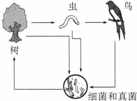 D 【解析】题图中只有1条完整的食物链:树→虫→鸟。题图中树是生产者,虫和鸟是消费者,细菌和真菌是生态系统中的分解者。鸟吃虫,利用了虫体内的部分能量。