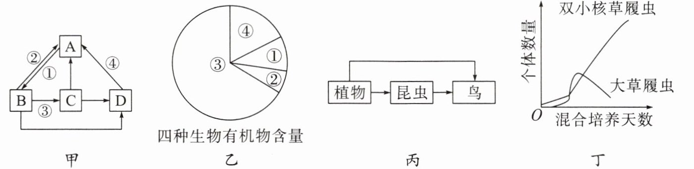 D 【解析】图甲中A为无机环境中的二氧化碳,B为生产者,C为消费者,D为分解者,①表示绿色植物的光合作用,②表示绿色植物的呼吸作用,③表示绿色植物被动物捕食,④表示微生物的分解作用。图乙中,①②③④构成的一条食物链是③→④→①→②,可见,在短时间内,①数量大量增加,则④减少、②增加。图丙中,鸟捕食昆虫,两者是捕食关系;鸟和昆虫都捕食植物,两者是竞争关系。图丁中,曲线表现出此消彼长的变化,说明大草履虫和双小核草履虫之间是竞争关系。