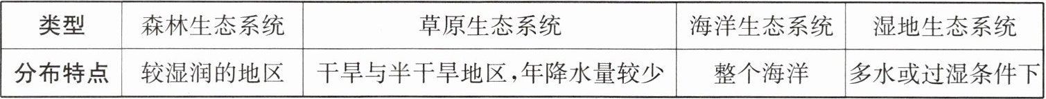 11. 地球上生态系统种类多样,下表为森林、草原、海洋和湿地生态系统的分布特点,请据表回答下列问题。