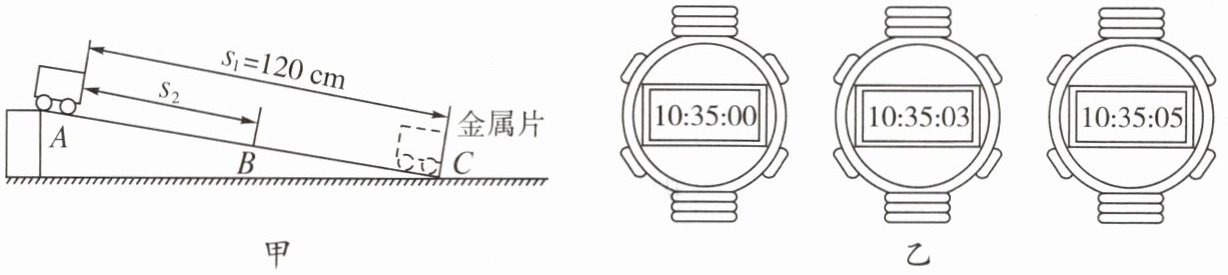5. 小明在测小车的平均速度的实验中,设计了如图甲所示的实验装置。小车从带有刻度的斜面顶端由静止下滑,小车到达 $ A $、$ B $、$ C $ 三处时电子表显示的时间如图乙所示(数字分别表示“时:分:秒”)。