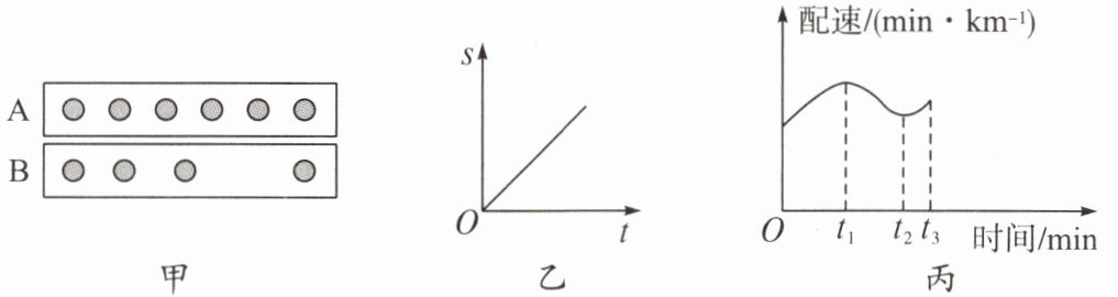 $ m/s $。(4)图丙是跑步者用随身携带的手机上的软件记录的“配速”(配速定义:运动时间与路程之比)随时间变化的图像,则在 $ t_1 $、$ t_2 $ 和 $ t_3 $ 三个时刻中,运动得最快的时刻是