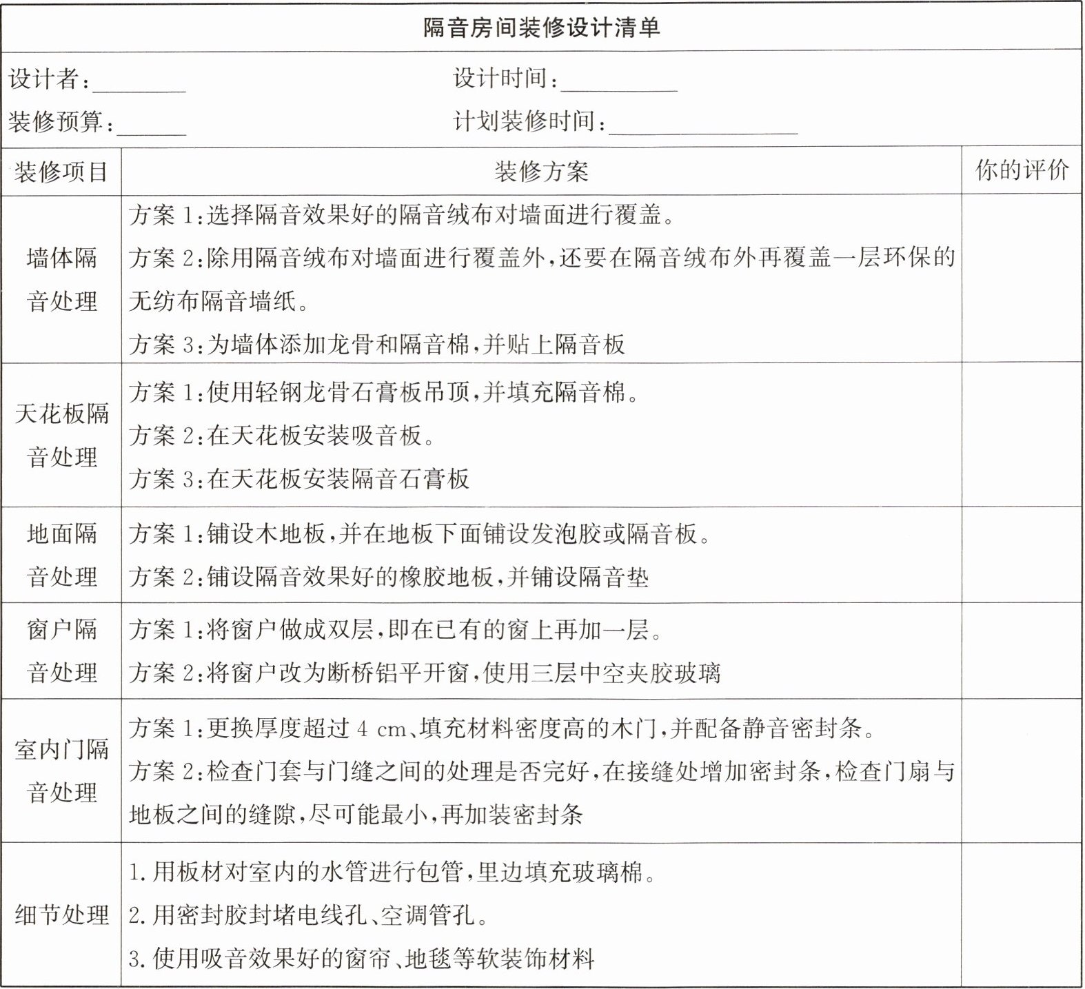 小明的爷爷睡眠质量不好,需要在隔音效果好、相对安静的环境中休息。一家人商量决定对爷爷居住的卧室进行改造,装修成为隔音房。小明从网上收集了一些处理方案,整理成装修设计清单,请根据所学知识,对小明的装修设计清单做出评价,并提出改进建议。