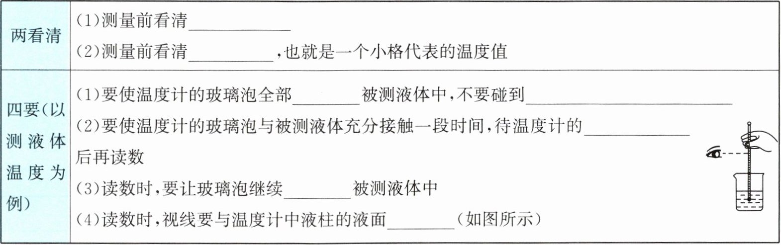 被测液体中,视线要与温度计中液柱的液面相平。2. 玻璃体温计