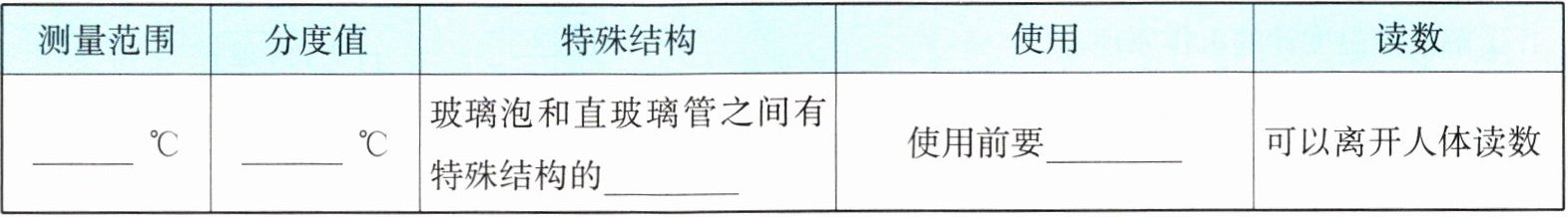 ℃。玻璃泡和直玻璃管之间有一段很细的细管(缩口/狭道),当体温计离开人体后,细管内水银断开,直管内的水银不能退回玻璃泡内,所以体温计能离开人体读数。使用前要用力甩一甩