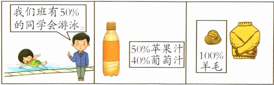 50%读作:百分之五十,表示会游泳的人数占班级总人数的50%。50%读作:百分之五十,表示纯苹果汁的含量占饮料总质量的50%;40%读作:百分之四十,表示纯葡萄汁的含量占饮料总质量的40%。100%读作:百分之百,表示羊毛含量占这件衣服成分的100%。