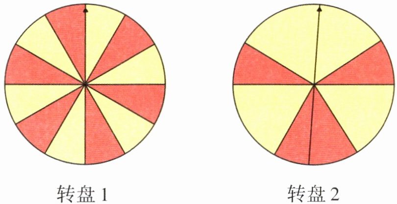 转盘1。因为转盘1指针停在红色区域和黄色区域的可能性相等。