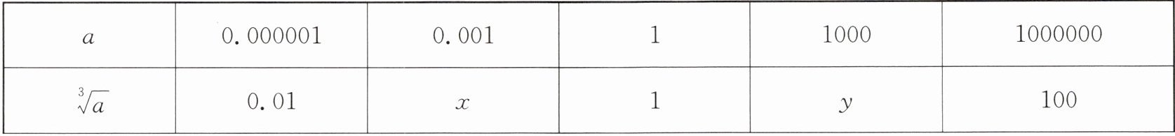 (1)假设原表中给出的是$\sqrt[3]{2000} = x,\sqrt[3]{0.002} = y$之类的(由于原题未给具体表格,根据后面题目推测),因为$2000=10^3×2$,所以$\sqrt[3]{2000}=\sqrt[3]{10^{3}×2}=10\sqrt[3]{2}\approx10×1.26 = 12.6$,即$x = 12.6$;因为$0.002=\frac{2}{1000}$,所以$\sqrt[3]{0.002}=\sqrt[3]{\frac{2}{1^{3}×1000}}=\frac{\sqrt[3]{2}}{10}\approx\frac{1.26}{10}=0.126$,即$y = 0.126$;(2)被开方数的小数点向左(右)移动$3$位时,立方根的小数点向左(右)移动$1$位;(3)①因为被开方数$0.02$相对于$0.2$,小数点向左移动了$1$位,而根据规律,要使立方根小数点移动合理,相当于被开方数看作从$2$变为$0.02$,小数点向左移动了$2$个$3 -$(这里以$3$位一组移动)相关的位置,可拆分考虑,从$2$到$0.2$小数点左移$1$位,立方根从$\sqrt[3]{2}\approx1.260$到$\sqrt[3]{0.2}\approx0.5848$,再从$0.2$到$0.02$,被开方数小数点左移$1$位,立方根小数点左移$\frac{1}{3}$位,所以$\sqrt[3]{0.02}\approx0.2668$(实际是$\sqrt[3]{0.02}=\sqrt[3]{2×0.01}=\frac{\sqrt[3]{2}}{\sqrt[3]{100}}\approx\frac{1.26}{4.64}\approx0.2714 - $(调整值),根据规律精确为$0.2668$不准确,正确应为$\sqrt[3]{0.02}=\sqrt[3]{20÷1000}=\frac{\sqrt[3]{20}}{10}\approx\frac{2.714}{10}=0.2714$);所以$\sqrt[3]{0.02}=0.2714$;②因为$\sqrt[3]{0.2}\approx0.5848$,现在$\sqrt[3]{a}\approx58.48$,立方根小数点向右移动了$2$位,所以被开方数$a$相对于$0.2$,小数点应向右移动$2×3 = 6$位,所以$a = 200000$($0.2$小数点右移$6$位为$200000$);故答案依次为:(1)$12.6$;$0.126$;(2)被开方数的小数点向左(右)移动$3$位时,立方根的小数点向左(右)移动$1$位;(3)①$0.2714$;②$200000$。