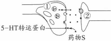 (2)药物S与5-羟色胺的转运蛋白结合,抑制5-羟色胺的回收,增加突触间隙中5-羟色胺含量。