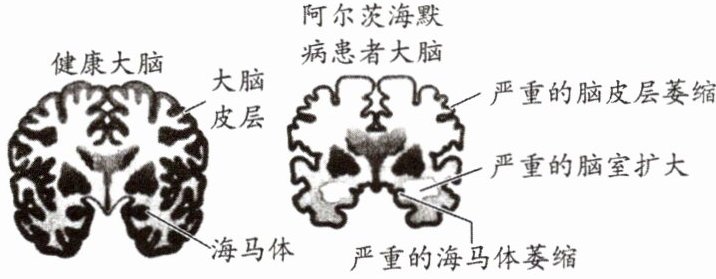 资料1 阿尔茨海默病是老年人常见的一种疾病,该病主要表现为患者逐渐丧失记忆和语言功能、计算和推理等思维能力受损(如迷路)、情绪不稳定。下图为健康人与阿尔茨海默病患者的大脑示意图。