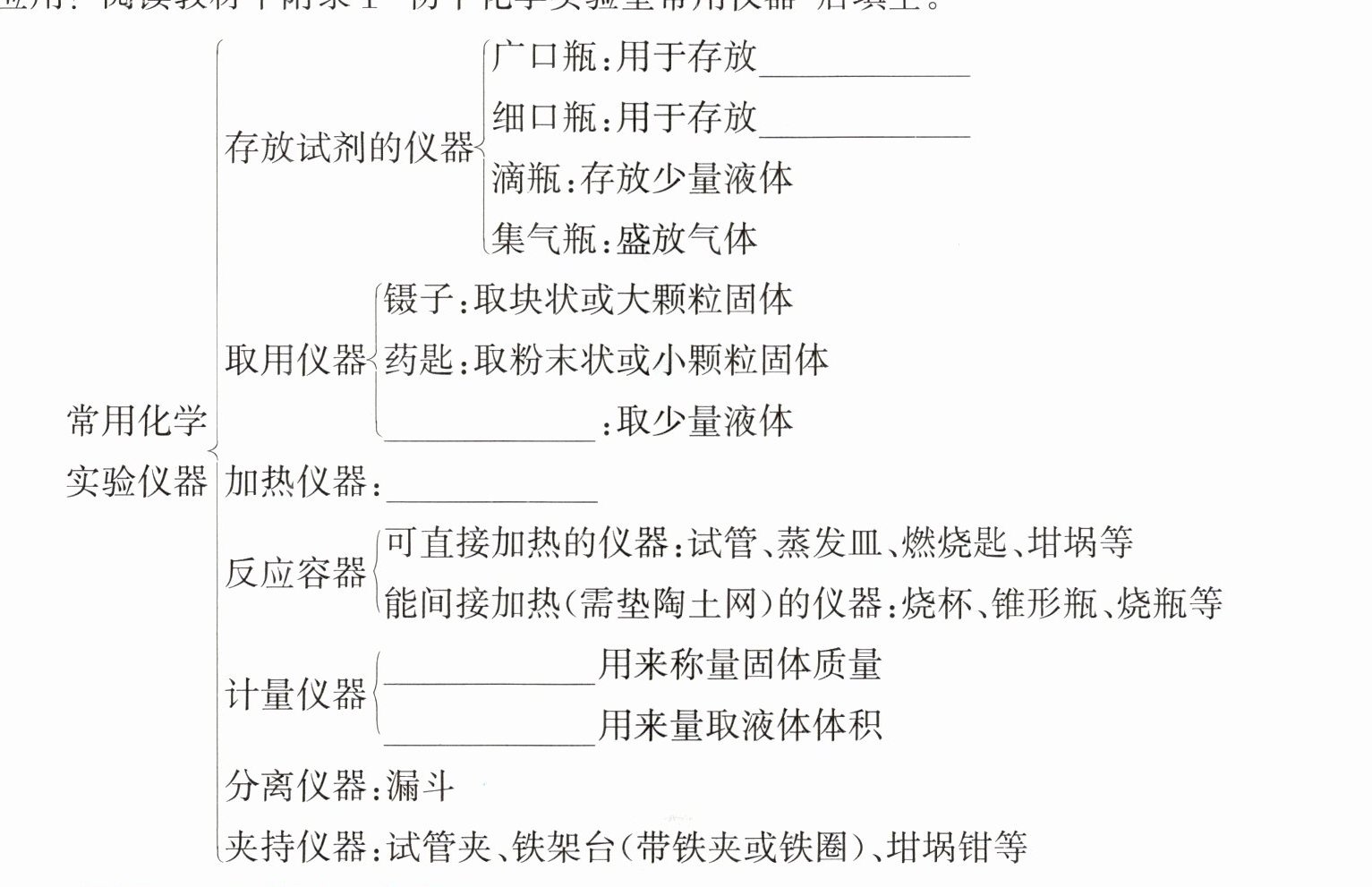 化学实验室是科学探究的重要场所,化学实验室有哪些常用的实验仪器,它们都有哪些应用?阅读教材中附录Ⅰ“初中化学实验室常用仪器”后填空。