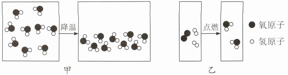 2. 如图所示,甲、乙分别是水蒸气液化、氢气在氧气中燃烧生成水的微观变化示意图。请回答下列问题。