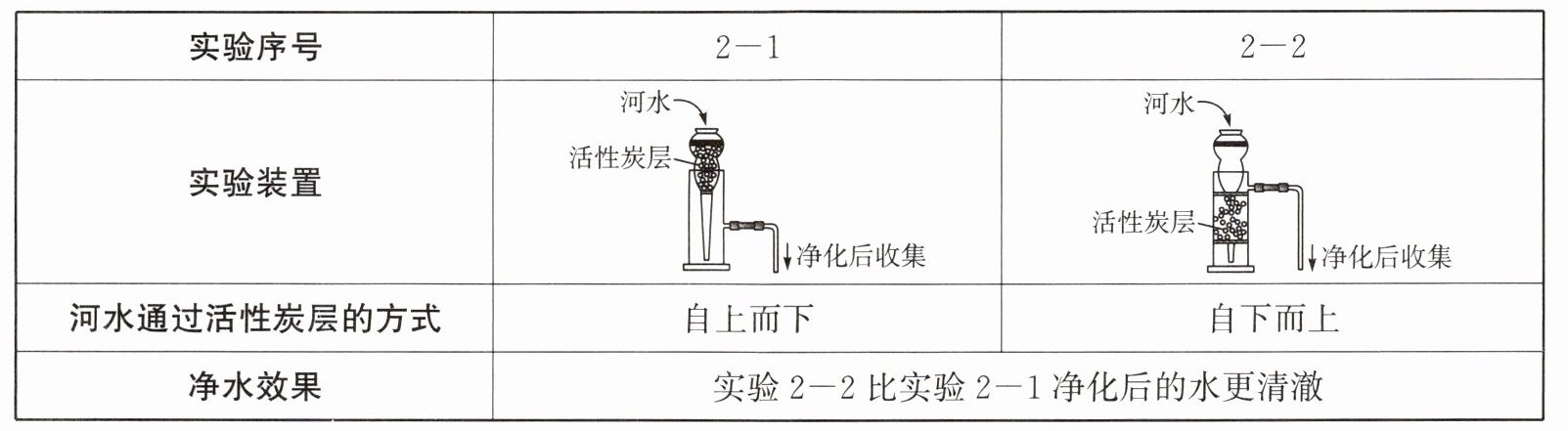 实验2:分别将相同流量河水注入填充等量活性炭的净化装置。实验记录如下: